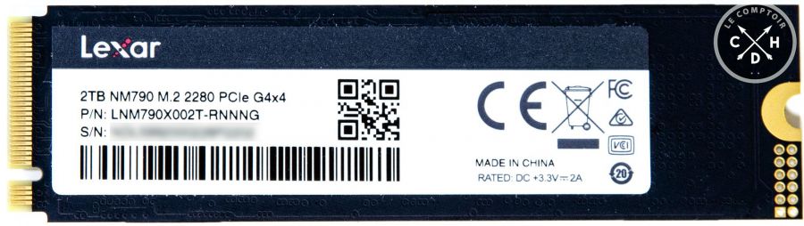 Côté conception, nous sommes sur un 2280 tout à fait classique, dans toutes les capacités avec des puces sur une seule face du PCB : de quoi anticiper la version 4 To, mais pas 8 To le contrôleur n'en étant pas capable. Pas de chichis ici, Lexar va au plus simple côté conception, et le SSD est simplement fourni avec une étiquette dissipatrice pour aider à juguler la chauffe, sachant que le SoC employé reste assez sage au niveau des chaleurs dégagées. C'est un clone du Predator GM7 de chez Acer.