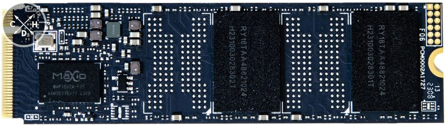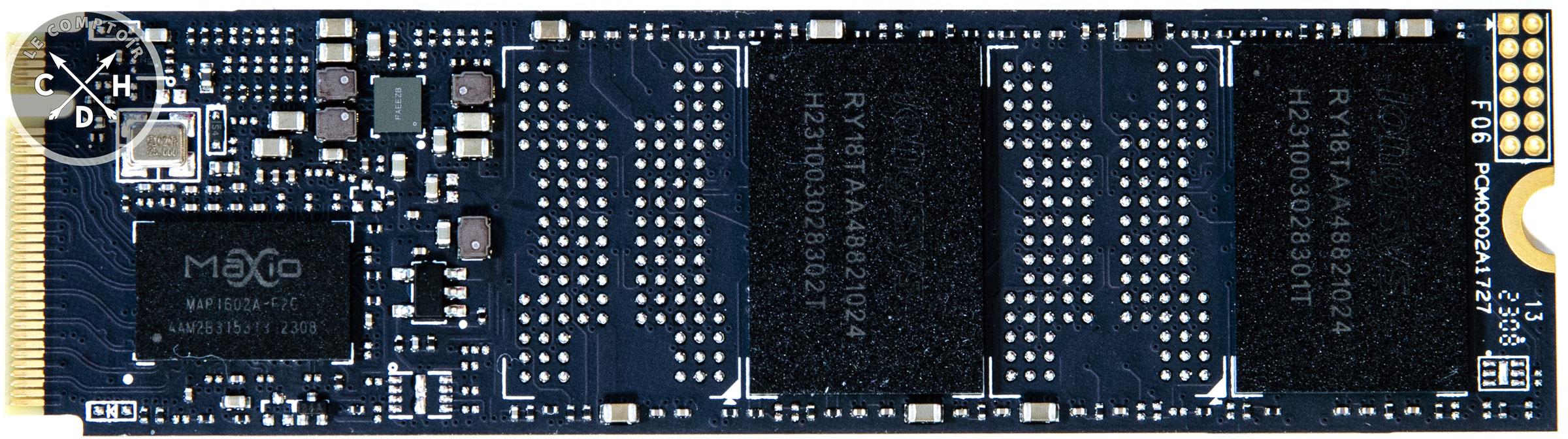 Sur ce NM790, c'est un MAP1602-A qui est embarqué, contrôleur gravé en 12 nm chez TSMC, de confession ARM Cortex-R5 et mono cœur. Il peut gérer jusqu'à 4 canaux NAND avec un bus jusqu'à 2400 MT/s par canal, suffisant pour saturer un lien PCIe 4.0 donc. Supportant des interfaces NAND ONFI 5.0 et Toggle 5.0, il est capable de délivrer jusqu'à 7,4 Go/s en lecture séquentielle et 6,5 Go/s en écriture séquentielle, 1 M / 900K D'IOPS sur les accès aléatoires : il est donc, sur ce NM790, configuré pour délivrer le meilleur de ses performances.