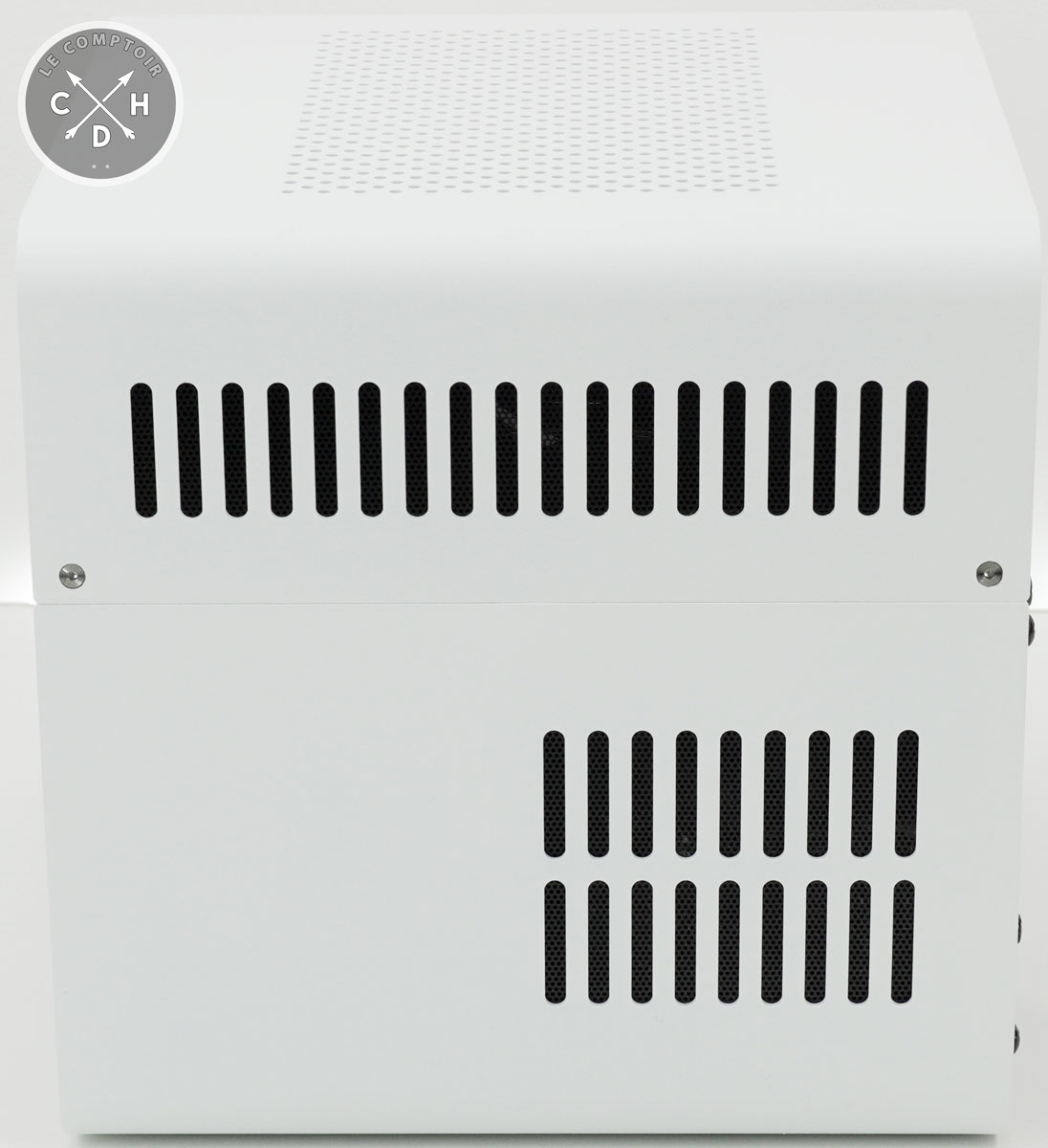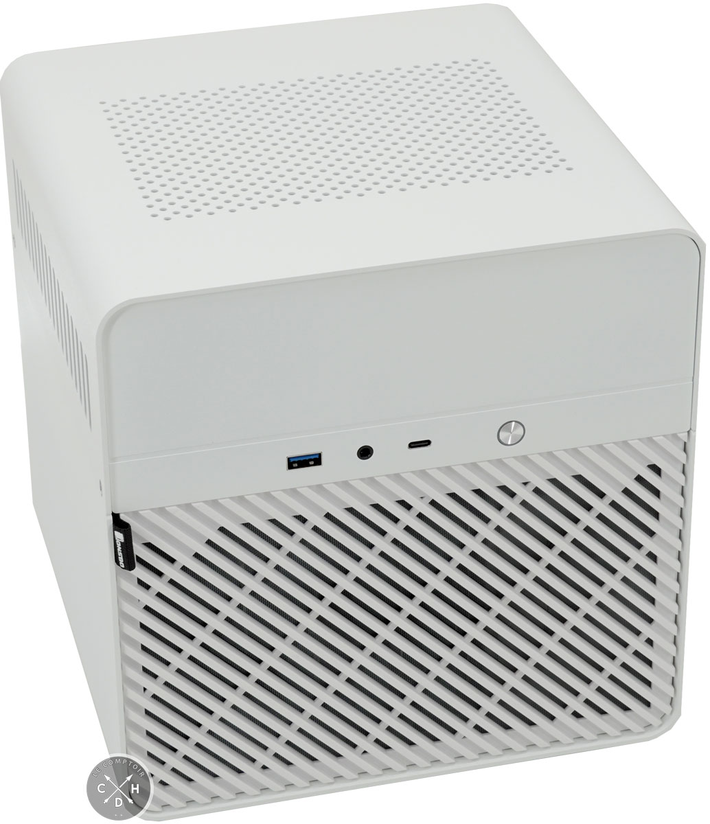 Allons à l'essentiel : le N2 est un boîtier cubique au format mini ITX. Ses dimensions sont de 224 mm de hauteur, pour 222,5 mm de largeur et de profondeur. Les coins sont arrondis et il est largement aéré. Constitué d'acier épais, il pèse près de 3 kg à vide.