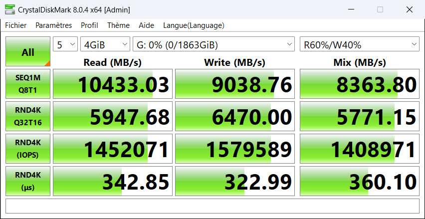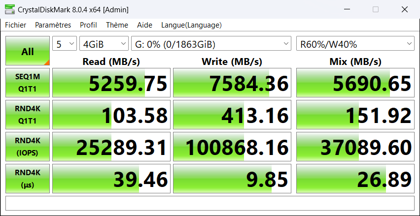 Sous cristaux d'amphétamines mark, avec l'utilisation de set de données incompressibles, les chiffres atteints se situent entre une unité haut de gamme en PCIe 5.0 et une unité haut de gamme en PCIe 4.0 : le deal est donc parfaitement respecté. Sur du random 4k, avec un niveau de performance sur les ~100 Mo/s en lecture et ~410 Mo/s en écriture, des progrès sont notables face au couple PCIe 4.0 / E27T, en particulier au niveau des latences, mais qui ici sont aussi dues à la NAND utilisée. Comme indiqué en page précédente, c'est bien, mais pas de quoi encore révolutionner le monde si ce n'est d'enfin utiliser ses liens 5.0 chèrement acquis.