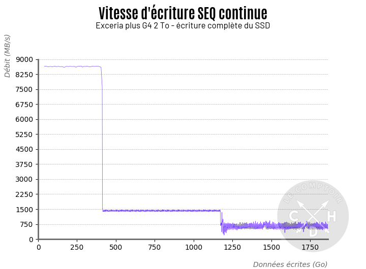 Un petit coup de remplissage de disque en écriture linéaire via IOmeter pour voir comment le disque se tient au cours de cette opération qui nous indique, entre autres, la quantité de TLC utilisée en pSLC. Cache pseudo SLC qui comme on peut le voir est assez large avec ~410 Go, et avec un très bon niveau de performance dépassant les 8,5 Go/s.