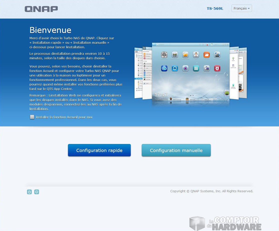 L'initialisation du NAS se passe en cinq étapes majeures. La première consiste à mettre l'appareil sous tension une fois que vous l'aurez équipé de disques durs. Ben oui, ça fonctionne mieux comme ça ! La seconde étape consiste à rechercher le matériel sur le réseau. Une fois découvert, vous tomberez sur la page web de la première capture d'écran. Vous aurez ici le choix de configurer manuellement l'installation ou de laisser faire l'appareil. Remarquez la petite option "Fonction accueil" qui permet dans le cas d'une installation chez un particulier de placer sur le bureau d'accueil les icônes multimédias plutôt que les raccourcis basics de gestion.