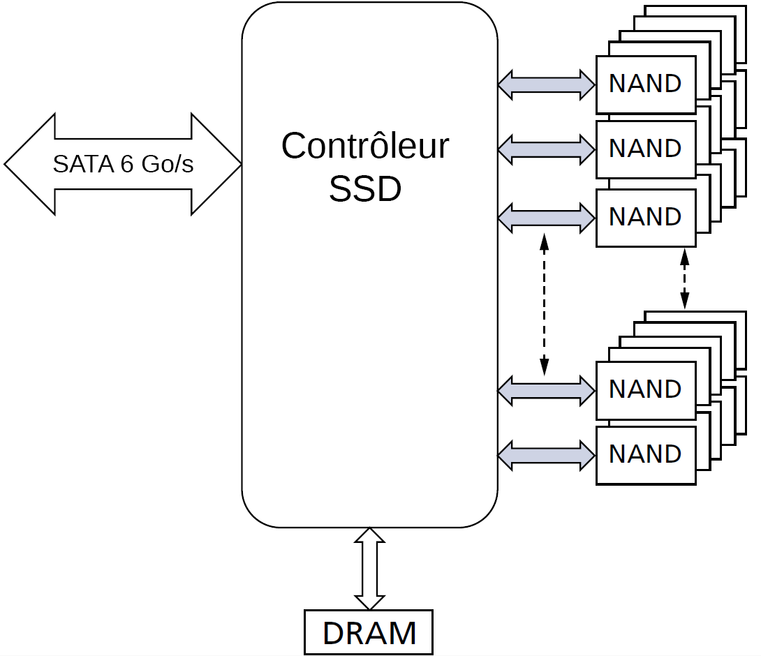 Nous verrons en détail ces 4 éléments dans la partie consacrée aux composants. On pourrait donc schématiser l'architecture d'un SSD par le diagramme suivant :