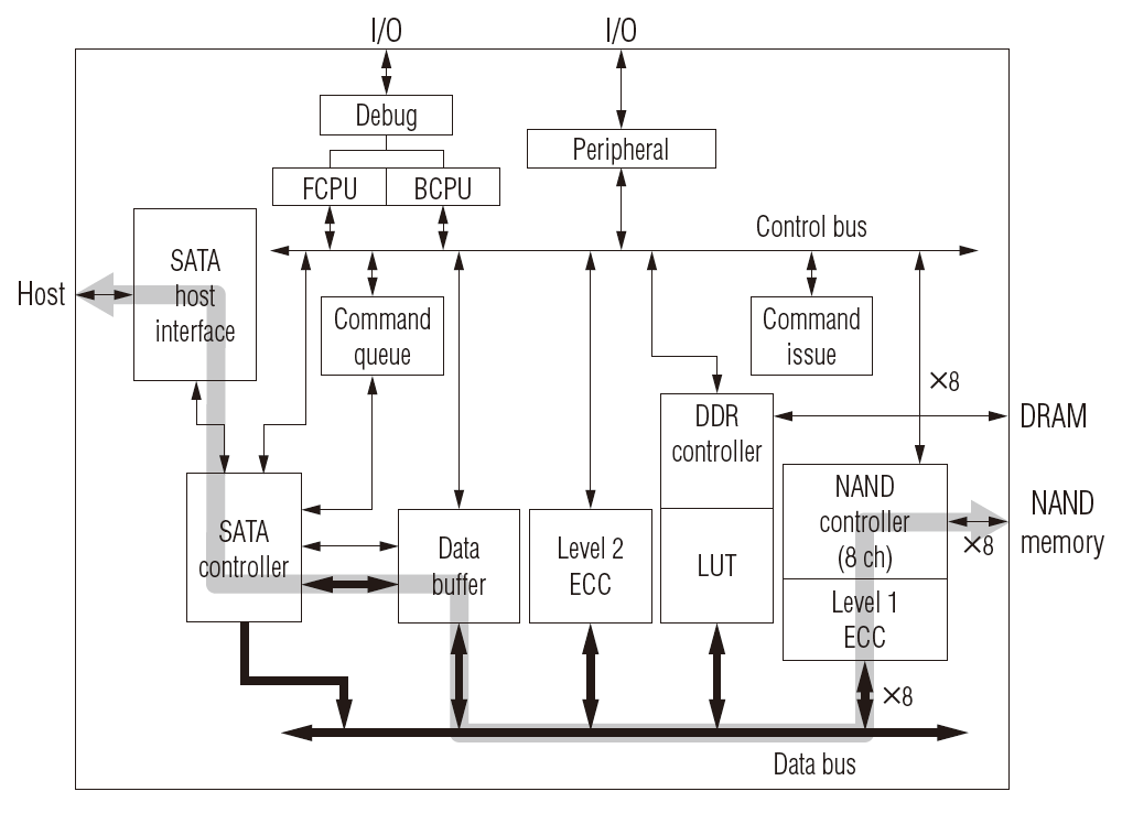 Le tampon de données (Data buffer) remplit la fonction d'adaptation de vitesse entre les accès depuis l'hôte et la mémoire NAND, et également d'écriture simultanée de multiples secteurs de données dans la mémoire NAND. La table de correspondance (LUT) détermine la relation entre l'adressage par bloc logique (LBA) et l'adresse physique dans la NAND.