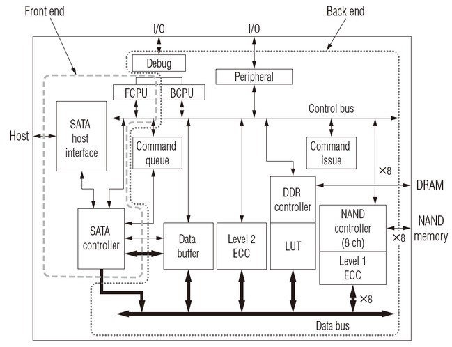 Quelques explications sur le fonctionnement s'imposent. Tout d'abord, on remarque 2 parties distinctes : le « front-end » qui regroupe l'interface hôte SATA ainsi que le contrôleur SATA, et le « back-end » qui regroupe le traitement des commandes et des informations, ainsi que le système d'accès aux mémoires NAND, le tout connecté par un bus de données. Il est souvent préféré une configuration multi-processeurs. Dans ce schéma, FCPU indique le CPU du front-end et BCPU celui du back-end, et le travail se fait toujours en parallèle pour accélérer les vitesses d'exécution, d'où la nécessité d'exploiter des CPU multi-cœurs.