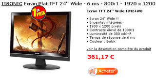 L'offre concerne un IIsonic IIM24WB, un 24" wide en 1900*1200 avec un temps de réponse de 6ms. Pour ce prix vous avez bien sûr une dalle TN, et pas de DVI, mais le DVI n'est de toute façon jamais présent sur les 24" de moins de 400€ donc le IIsonic ne fait pas moins bien que ses concurrents directs à 380€ environ.
